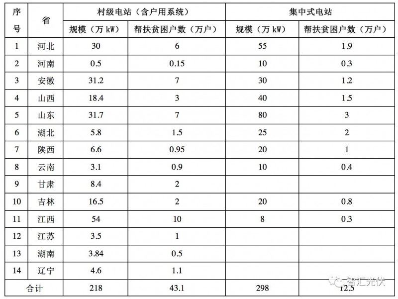 在此基礎(chǔ)上,2016年多個省份的能源局聯(lián)合當(dāng)?shù)氐姆鲐毠ぷ餍〗M,將“光伏扶貧”作為農(nóng)村脫貧的重要方式。2016年,在14個省份實(shí)施5168萬kW光伏扶貧項(xiàng)目,幫扶貧困群眾55.6萬戶,如下表所示。