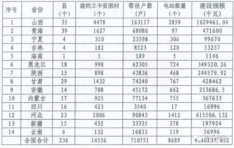 2017年,僅村級扶貧一項(xiàng)就幫扶14個省、236個光伏扶貧重點(diǎn)縣14556個建檔立卡貧困村的71.0751萬戶建檔立卡貧困戶,如下表所示。