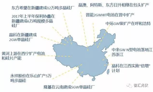 除了硅料環(huán)節(jié),各企業(yè)硅片環(huán)節(jié)的擴(kuò)產(chǎn)基本也都布局在西部地區(qū)。如單晶硅片龍頭企業(yè)隆基在云南楚雄布局了10GW的單晶硅片產(chǎn)能,將在2018年底投產(chǎn);晶澳、阿特斯、東方日升等企業(yè)在內(nèi)蒙也有擴(kuò)產(chǎn)。在此引用中國光伏行業(yè)協(xié)會王勃華秘書長之前的圖片作為說明。