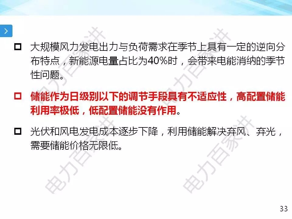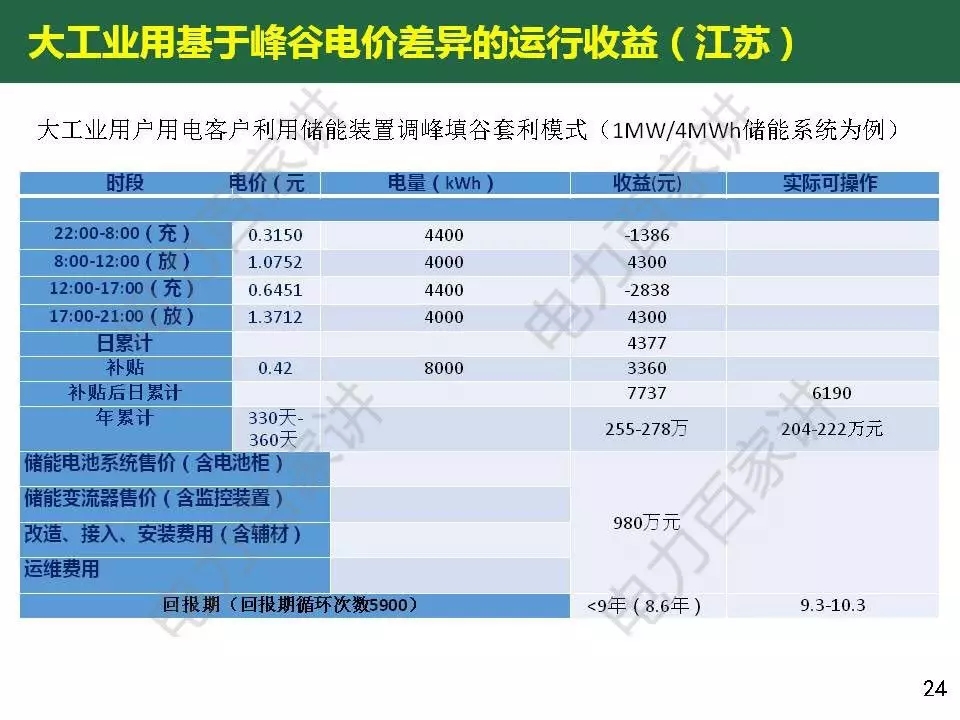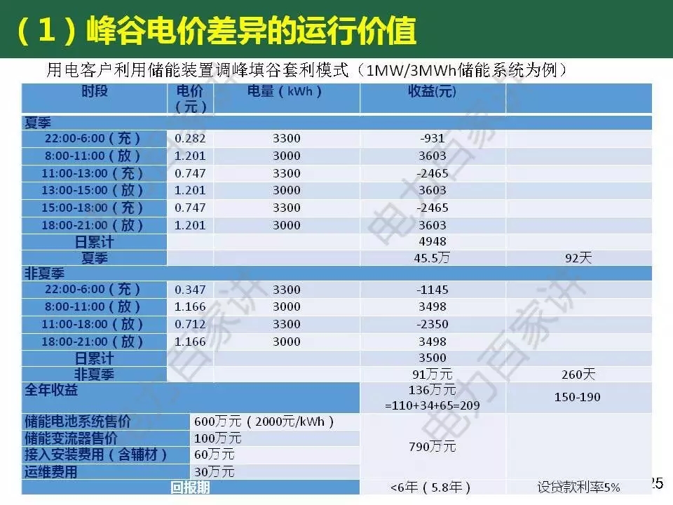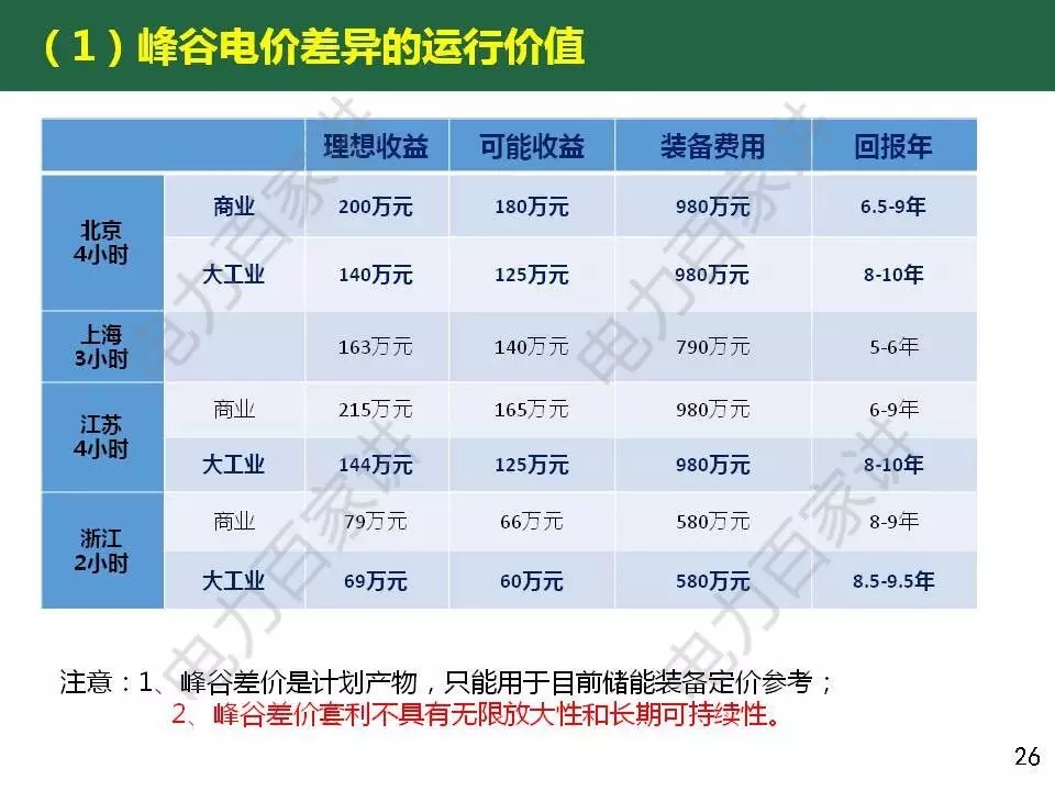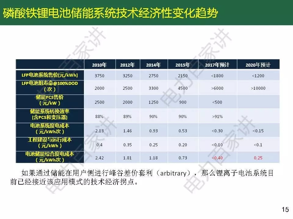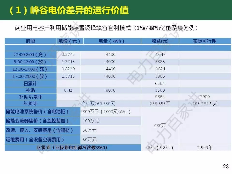 惠東教授還對(duì)目前商業(yè)化初期的儲(chǔ)能應(yīng)用經(jīng)濟(jì)性進(jìn)行了分析,他表示峰谷電價(jià)差套利的模式,價(jià)差要達(dá)到6毛以上,如果要在5年內(nèi)收回成本,電池系統(tǒng)價(jià)格要降到1.2元/wh以下(目前鋰電池系統(tǒng)價(jià)格在2000元/ kWh);解決棄風(fēng)問(wèn)題的儲(chǔ)能應(yīng)用不具備經(jīng)濟(jì)價(jià)值,即使儲(chǔ)能價(jià)格再下降一半。