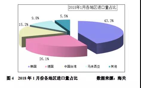 第二,從德國(guó)進(jìn)口量位居高位。1月份從德國(guó)進(jìn)口量為4252噸,環(huán)比增加11.7%,占總進(jìn)口量的26.2%,1月份進(jìn)口量實(shí)際為12月份交易情況,而2017年12月份下游需求仍維持火熱,因此從德國(guó)進(jìn)口量位居高位。