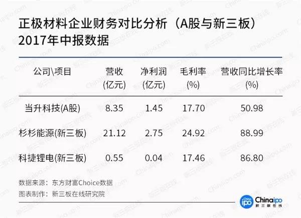 如果對分類財務指標進一步分析,可以發(fā)現(xiàn),新三板的杉杉能源全面勝出,無論是營收還是凈利潤,亦或是毛利率和成長性,均高出A股上市公司當升科技。