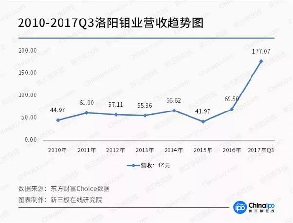 洛陽鉬業(yè)的財報數(shù)據(jù)顯示,2010年洛陽鉬業(yè)全年營收約44.97億元,而截至2017年三季度洛陽鉬業(yè)的營收已經(jīng)達到177億元,2017全年突破220億元應無懸念??瓷先?年營收增長近4倍,成績相當優(yōu)秀,但仔細扒開研究,就能發(fā)現(xiàn)業(yè)績真正的拐點是在今年年初,影響業(yè)績大幅提升一方面來自于收購剛果金的鈷礦,另一方面與鈷價爆發(fā)也有直接的關(guān)系。所以雙因素的推動下,我們看到,2017年的業(yè)績翻倍上漲。