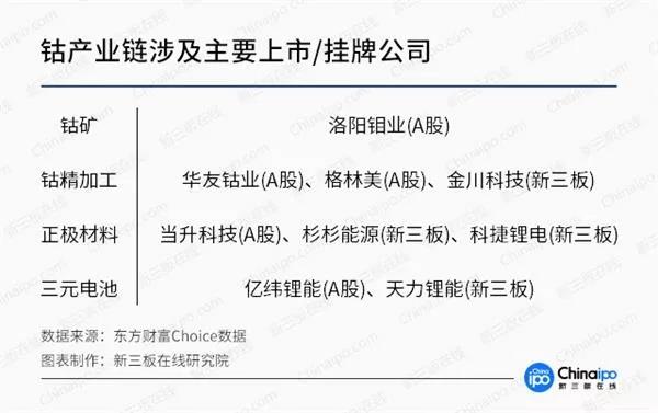 而國內(nèi)來說,精煉鈷的主要公司有華友鈷業(yè)(A股)、格林美(A股)、金川科技(新三板)。其余中下游如正極材料和三元電池也都出現(xiàn)了A股和新三板公司的身影。