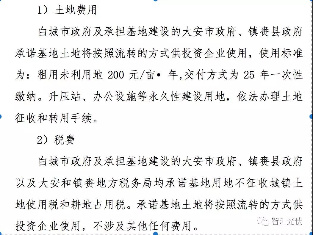 可見,白城領(lǐng)跑者中,當(dāng)?shù)卣鞔_征地費(fèi)用只包含“升壓站、辦公場(chǎng)址”等永久用地,其他都以200元/畝/年的價(jià)格租用。