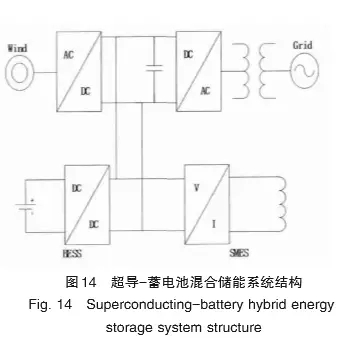 目前研究較多的SMES混合儲能主要是超導-蓄電池混合儲能。超導-蓄電池混合儲能是將SMES與電池儲能系統(tǒng)(batteryenergystoragesystem,BESS)相結合的一種混合儲能裝置。它采用共直流母線的結構,風機通過變流器和變壓器連接到電網(wǎng),SMES和BESS通過各自的DC/DC斬波器連接到直流母線上(圖14)。
