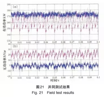 圖20是有功平滑的實驗結果。在實驗過程中,非線性負載的功率由50kW跳變到100kW后跳變回50kW。在負荷突增時,儲能線圈的電流從300A下降到260A,從而為突增的負荷提供突變的有功功率;而在負荷突降時,儲能線圈從電網(wǎng)吸收有功功率,儲能線圈的電流逐漸增加到300A。在負荷突增或者突降時,電網(wǎng)電流的幅值沒有明顯變化,這表明負荷突變對電網(wǎng)的沖擊大大減輕,有效地實現(xiàn)了有功平滑的功能。