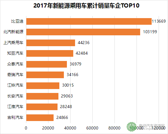 從車企表現(xiàn)看,2017年新能源乘用車?yán)塾?jì)銷量突破十萬臺(tái)的車企有兩家,其中比亞迪累計(jì)銷售113669,占比20.43%,奪得冠軍;北汽新能源累計(jì)銷售103199臺(tái),占比18.55%奪得亞軍。