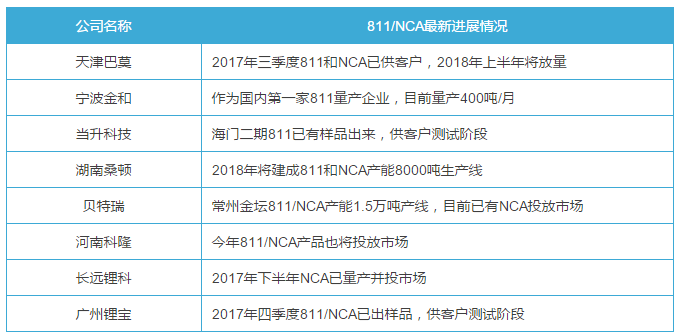 此外,廈門鎢業(yè)、優(yōu)美科等主流廠家紛紛進(jìn)行811/NCA產(chǎn)品的技術(shù)儲(chǔ)備,在不遠(yuǎn)的將來(lái),也將有產(chǎn)品面市。