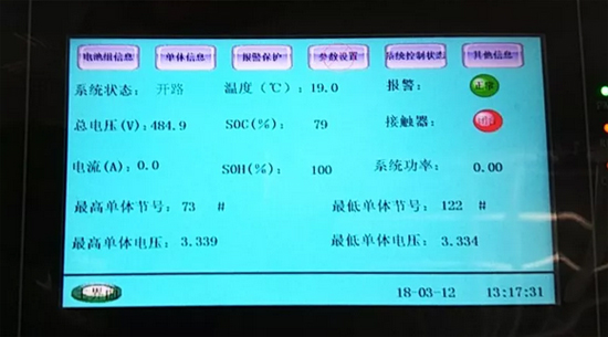 該系統(tǒng)由144個(gè)120Ah電芯串聯(lián)而成,配備可視化的人機(jī)操作界面。系統(tǒng)有離網(wǎng)和并網(wǎng)兩種工作模式,并離網(wǎng)轉(zhuǎn)換時(shí)間≤80ms,轉(zhuǎn)換過程不會(huì)影響用戶的正常用電需求。其電池管理系統(tǒng)具有信息采集、判斷、處置功能,可對電芯電壓、溫度、電流等進(jìn)行有效管理。