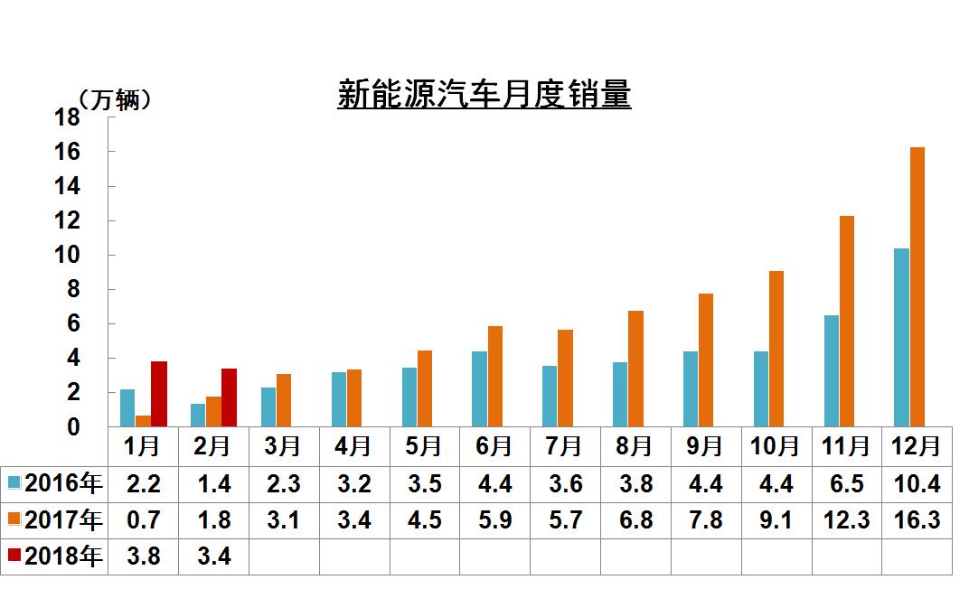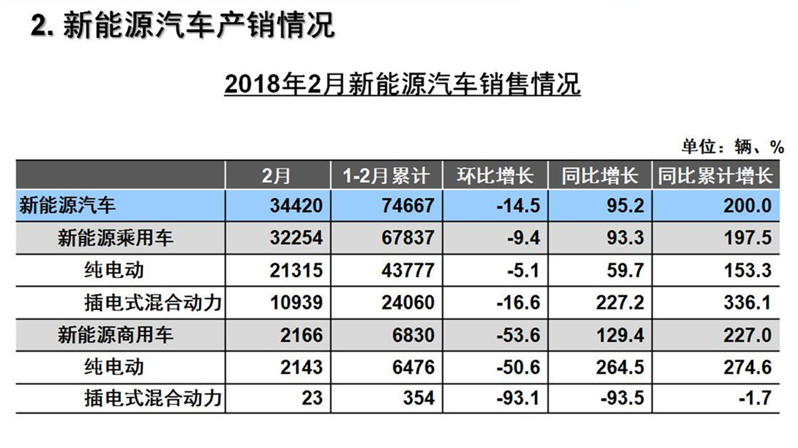 2月,新能源汽車產(chǎn)銷分別為39230輛和34420輛,同比分別增長119.1%和95.2%。1-2月,新能源汽車生產(chǎn)81855輛,銷售74667輛,同比分別增長225.5%和200%。