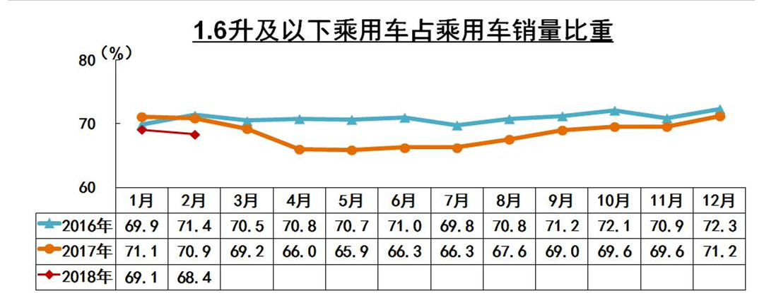 值得關(guān)注的是, 2月份1.6升及以下乘用車銷售100.9萬輛,同比下降12.4%,占乘用車銷量比重為68.4%,同比下降2.2個百分點。1~2月,1.6升及以下乘用車銷售270.6萬輛,同比下降0.8%,占乘用車銷量比重為68.3%,同比下降2個百分點。1.6升及以下中國品牌乘用車銷售143萬輛,同比增長2.7%。