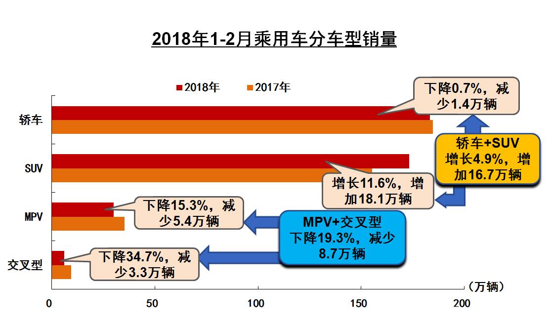 在整體增速下滑的市場中,部分車型下降的更嚴重,尤其是交叉型乘用車。1~2月產(chǎn)銷同比分別下降41.9%和34.7%。
