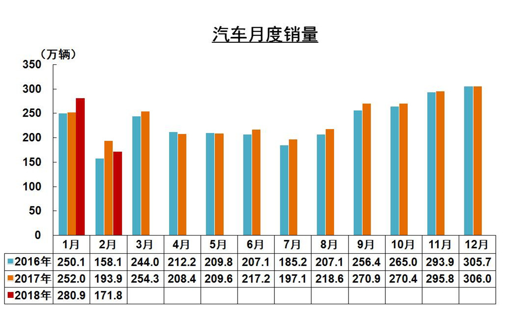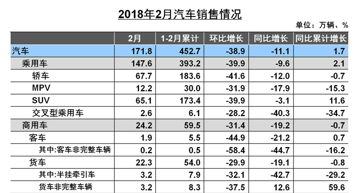 2月,汽車產(chǎn)銷分別為170.6萬輛和171.8萬輛,環(huán)比分別下降36.6%和38.9%,同比分別下降20.8%和11.1%。
