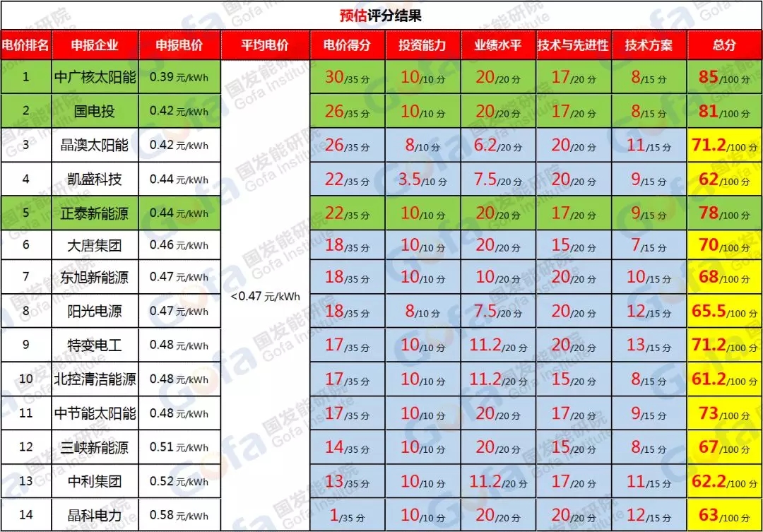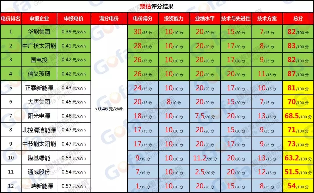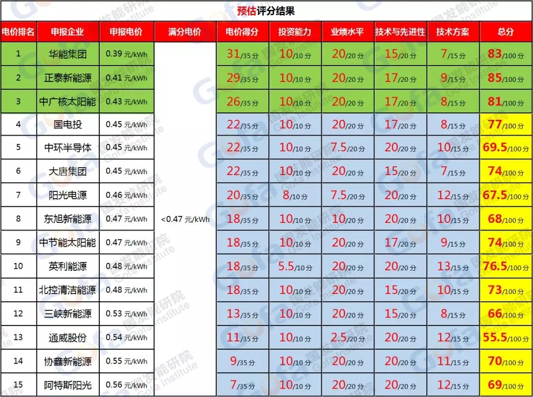 從項(xiàng)目4預(yù)估評(píng)分結(jié)果來(lái)看,信義玻璃、中廣核、華能、國(guó)電投等四家企業(yè)較有優(yōu)勢(shì)。其中“電價(jià)得分”并不占優(yōu)勢(shì)的制造型企業(yè)信義玻璃,將有可能通過(guò)技術(shù)先進(jìn)性與技術(shù)方案兩項(xiàng)得分戰(zhàn)勝此標(biāo)段最低電價(jià)華能集團(tuán)。