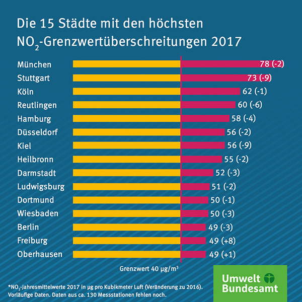 德國給人的印象往往是干凈的城市、清新的空氣、美麗的自然。誰能想到,德國也有城市必須面對霧霾侵襲問題。德國聯邦環(huán)境署最新的統(tǒng)計顯示,2017年德國約有70座城市的大氣二氧化氮濃度高于歐盟限值,即氮氧化物(二氧化氮)污染物每立方米平均值超過40微克(40μg/m3)。慕尼黑、斯圖加特和科隆等城市都是德國空氣污染嚴重的地區(qū),慕尼黑去年的氮氧化物污染物平均值是每立方米78微克,是德國污染最嚴重的地區(qū)。斯圖加特是73微克,排在第2名。克隆排第3名。(參見下圖)