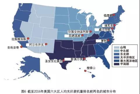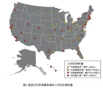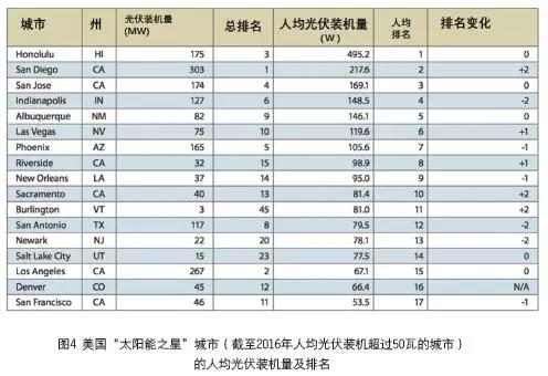 美國的主要城市在清潔能源革命中發(fā)揮了關(guān)鍵作用。作為人口中心,城市是電力需求的主要來源,同時擁有數(shù)以百萬計適合安裝太陽能電池板的屋頂。依據(jù)“Shining Cities 2017”報告,2016年度的數(shù)據(jù)表明,圣地亞哥在太陽能光伏總裝機方面領(lǐng)先全國,總量為30.3 萬千瓦,其次是洛杉磯(26.7萬千瓦)、檀香山(17.5萬千瓦)、圣何塞(17.4 萬千瓦)、鳳凰城(16.5萬千瓦)。