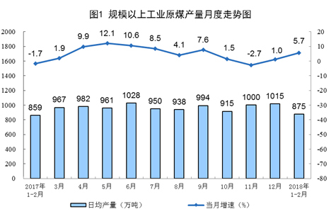 1-2月份,原煤產(chǎn)量5.2億噸,同比增長5.7%,去年同期為下降1.7%;日均生產(chǎn)875.1萬噸。