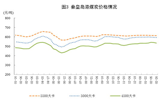 截至2月底,秦皇島5500大卡煤炭平倉價為每噸613元,比去年年底下降4元;5000大卡每噸593元,下降4元;4500大卡每噸535元,上漲8元,煤炭價格基本保持穩(wěn)定。