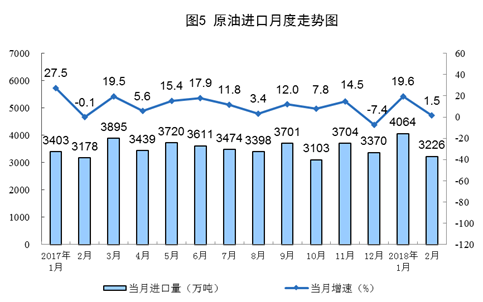 原油進口保持較快增長。1月份和2月份分別進口原油4064和3226萬噸,同比增長19.6%和1.5%。