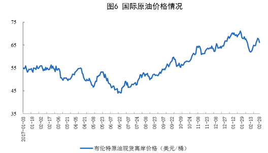 原油價格小幅震蕩。1-2月份,布倫特原油現(xiàn)貨離岸價格在60-70美元/桶間小幅震蕩。截至2月28日,價格為66.1美元/桶,比去年12月底下跌0.7美元/桶。