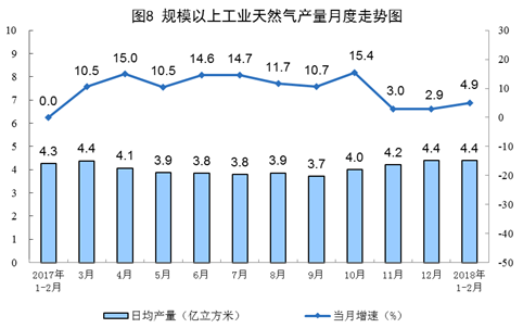 1-2月份,天然氣產(chǎn)量261.9億立方米,同比增長4.9%,增速比去年同期加快4.9個百分點;日均生產(chǎn)4.4億立方米。
