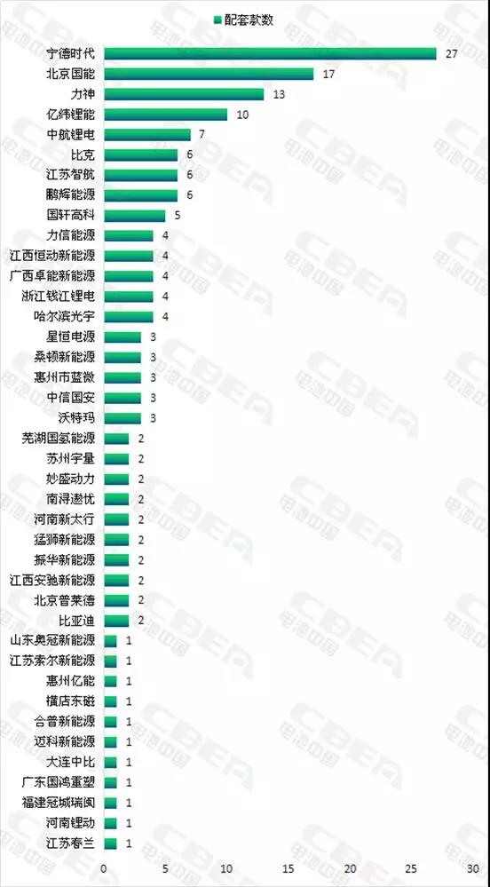 從配套的電池企業(yè)來看,第306批新車公示目錄中163款新能源專用車涉及配套電池企業(yè)有40家,配套電池企業(yè)比較分散,只有4家電池企業(yè)配套超過10款車型,分別為寧德時(shí)代、北京國能、力神和億緯鋰能,配套車型款數(shù)分別為27款、17款、13款和10款。其余的中航鋰電配套7款車型;鵬輝能源、江蘇智航和比克3家電池企業(yè)分別配套6款車型;國軒高科配套5款車型,哈爾濱光宇、浙江錢江鋰電、廣西卓能新能源、江西恒動新能源和力信能源5家電池企業(yè)分別配套4款車型;沃特瑪、中信國安、惠州市藍(lán)微、桑頓新能源和星恒電源5家電池企業(yè)分別配套3款車型,其余還有10家電池企業(yè)分別配套2款車型和11家電池企業(yè)分別配套1款車型。(備注:涉及燃料電池專用車配套電池企業(yè)有同時(shí)搭載燃料電池和其它類別電池的電池企業(yè)只選用燃料電池企業(yè))