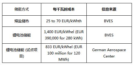 如上表,BVES方面表示,需要注意的是,無論是直接換熱還是間接換熱,根據(jù)溫差和運(yùn)行方式的不同,具體成本也會有所差別,因此,資料提供的成本數(shù)據(jù)范圍在25-70歐元/kWhth之間。而使用大型鋰電池的六個(gè)示范系統(tǒng)(由能源供應(yīng)商STEAG建造)的儲電成本則高達(dá)833歐元/kWhel。