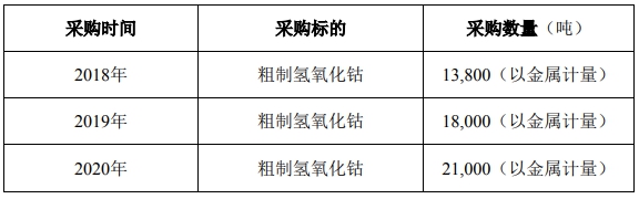 根據(jù)協(xié)議,格林美及三家子公司從2018年到2020年向嘉能可采購的粗制氫氧化鈷分別為13800噸、18000噸、21000噸(金屬當量)。如下表。