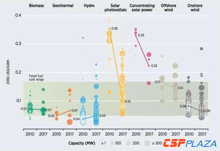 截止2016年末,光熱發(fā)電和海上風(fēng)電的累計裝機(jī)量分別為5GW和13GW,兩者的實際發(fā)電成本雖然相比其它可再生能源仍較高,但總體來看成本呈下降趨勢。尤其是光熱發(fā)電,在2016年~2017年間,國際光熱發(fā)電市場出現(xiàn)了一系列創(chuàng)歷史新低的中標(biāo)價格。
