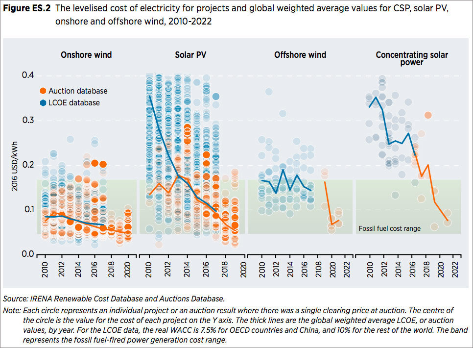 報告顯示,無論是近期數(shù)據(jù)還是未來預(yù)計,光熱發(fā)電、光伏發(fā)電、海上風(fēng)電、陸上風(fēng)電四種主要可再生能源的發(fā)電成本均明顯下降。IRENA認(rèn)為,成本下降主要源于以下因素:1)競標(biāo)機(jī)制讓成本更加透明化;2)國際競爭將大量經(jīng)驗豐富的開發(fā)商帶入新興市場,其專業(yè)技術(shù)、購買力和進(jìn)入國際金融市場的便利性進(jìn)一步降低了項目成本和風(fēng)險;3)技術(shù)進(jìn)步帶來的效率提高。