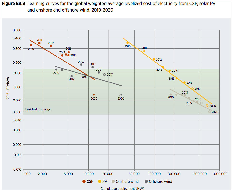 IRENA根據(jù)學(xué)習(xí)曲線模型估計,2010年到2020年期間,光熱發(fā)電的學(xué)習(xí)率有望達(dá)到30%(學(xué)習(xí)率,learning rate,學(xué)習(xí)曲線效應(yīng)的量化值,即裝機(jī)規(guī)模每翻一番,成本會隨之下降的百分比),而海上風(fēng)電、陸上風(fēng)電和光伏發(fā)電的學(xué)習(xí)率則分別為14%、21%和35%。