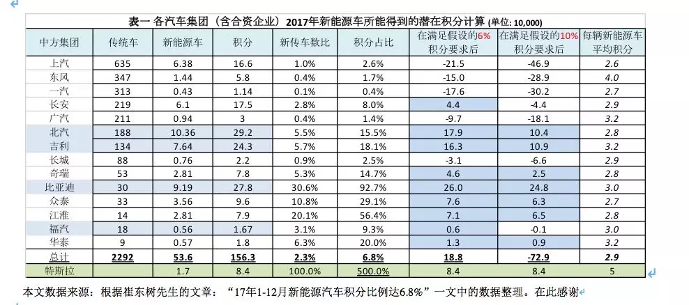 每個(gè)法人單位的數(shù)據(jù)不容易獲得,但如表一所示,假如我們?cè)O(shè)想2017年需要完成10%的積分要求的話(huà),擁有合資企業(yè)的前五大集團(tuán)公司都是缺分大戶(hù)。假如我們?cè)O(shè)想2017年需要完成6%的積分要求的話(huà),五大集團(tuán)中只有長(zhǎng)安有多余積分,但長(zhǎng)安和其合資企業(yè)福特需要新能源汽車(chē)的正積分來(lái)抵油耗標(biāo)準(zhǔn)的負(fù)積分。當(dāng)然第一大戶(hù)上汽乘用車(chē)本身,不包括合資部分,2017年新能源車(chē)積分已達(dá)到13%;可以設(shè)想上汽的多余積分會(huì)留在集團(tuán)內(nèi)。所有企業(yè)中,有最多盈余積分的是比亞迪,后面遠(yuǎn)遠(yuǎn)跟著的是吉利和北汽。在本土企業(yè)里,長(zhǎng)城最低,但還是遠(yuǎn)遠(yuǎn)好于合資企業(yè)。表一所示,整個(gè)行業(yè)去年平均每輛新能源汽車(chē)可產(chǎn)生2.9個(gè)積分。東風(fēng)集團(tuán)的新能源車(chē)每輛可得4個(gè)積分。比亞迪因?yàn)橛性S多插電混合動(dòng)力車(chē),平均分為3。而上汽的新能源車(chē)平均每輛獲得2.6分。
