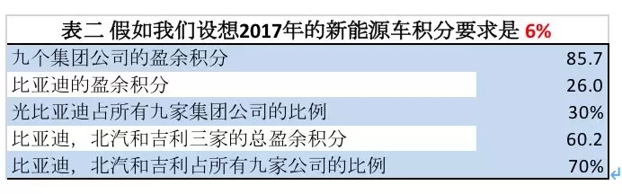 假如我們?cè)O(shè)想2017年實(shí)行6%的新能源汽車(chē)積分政策,在表一中共有9個(gè)集團(tuán)公司有盈余積分。比亞迪的盈余積分占可交易的全部盈余積分的30%。比亞迪、吉利和北汽集團(tuán)共占市場(chǎng)的70%(表二)。