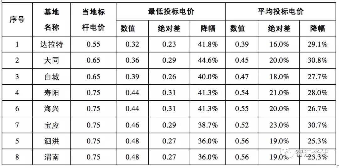1、最低電價(jià)相對于標(biāo)桿電價(jià)降幅都在40%以上,電價(jià)不下降25%幾乎無中標(biāo)可能性;