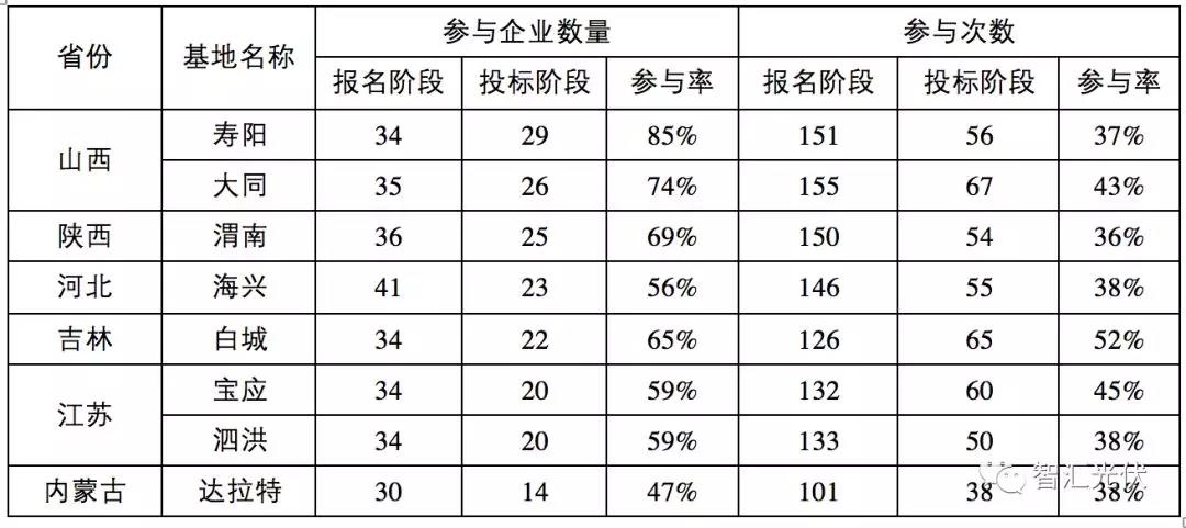 3)8個(gè)基地中,最受追捧的就是山西省的壽陽、大同兩個(gè)項(xiàng)目,分別為參與企業(yè)數(shù)量最多、企業(yè)投標(biāo)次數(shù)最多;而內(nèi)蒙古的達(dá)拉特旗是此次應(yīng)用領(lǐng)跑者中報(bào)名企業(yè)數(shù)量最少、企業(yè)投標(biāo)次數(shù)最少的項(xiàng)目,榮膺第三次應(yīng)用領(lǐng)跑者基地中“最冷清”獎(jiǎng)!