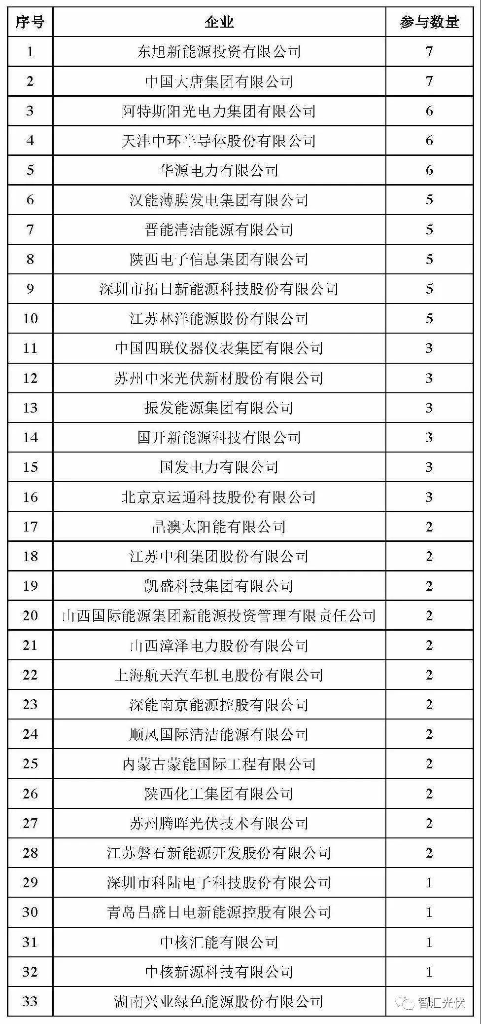一共7家企業(yè)參與了30個(gè)以上項(xiàng)目的投標(biāo)工作。其中,國電投、中廣核參與了全部項(xiàng)目的投標(biāo);除了陽光電源、協(xié)鑫之外,其他5家均為央企、國企背景。由于此次投標(biāo)、中標(biāo)后要繳納3000萬元/100MW的保證金,如果中標(biāo)項(xiàng)目過多,一般企業(yè)保證金都交不起。