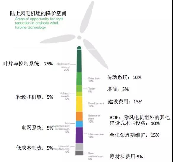 BP認(rèn)為未來(lái)風(fēng)電項(xiàng)目的綜合成本會(huì)在裝機(jī)量每增加1倍時(shí)下降14%。下降的風(fēng)電項(xiàng)目成本主要來(lái)自于(圖四)所示的幾個(gè)方面,其中葉片和控制系統(tǒng)成本、傳動(dòng)系統(tǒng)成本、風(fēng)機(jī)運(yùn)營(yíng)維護(hù)成本的大幅下降是風(fēng)電開(kāi)發(fā)成本走低的主要推手,而葉片與控制系統(tǒng)價(jià)格有望下降25%,是所有風(fēng)電組件中價(jià)格下降幅度最大的。