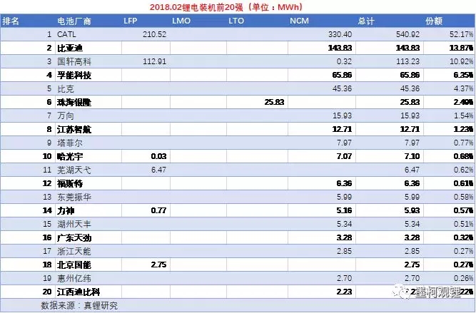 上表是前兩個月累計裝機20強榜單。從上表可以看到,CATL以1.2GWh占據(jù)了一半的市場份額。比亞迪以258.4MWh占比10.98%排名第二,較1月排名前進(jìn)一名。國軒高科以242.98 MWh占比10.32%排在第三位,較1月下降一名。第四名孚能科技以138MWh占比5.86%,第五名比克的累計裝機量不到70MWh,不足孚能科技的一半。塔菲爾進(jìn)展迅速,去年底才實現(xiàn)裝機,目前已在排行榜位居第18位。雖然前兩個月的裝機數(shù)據(jù)不能說明什么,但總體感覺電池廠商的兩極分化有加劇的跡象。