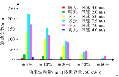 從圖2的統(tǒng)計(jì)結(jié)果看出:功率波動(dòng)幅值主要集中在光伏裝機(jī)容量的±5%~±40%范圍內(nèi),超過±60%范圍的功率波動(dòng)次數(shù)較少;多云天氣下,功率波動(dòng)更頻繁,主要是由于云移動(dòng)過程中頻繁地遮擋太陽造成;晴天和陰天下功率波動(dòng)次數(shù)很少,幅值也很低,主要因?yàn)榍缣煸粕?對(duì)太陽的遮擋較少,而陰天光伏本身出力就低,使得功率的可波動(dòng)范圍相應(yīng)地被縮小。