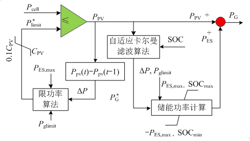 卡爾曼濾波算法在電力系統(tǒng)狀態(tài)估計(jì)、新能源發(fā)電等方面得到了廣泛應(yīng)用[17],本文采用自適應(yīng)卡爾曼濾波算法對(duì)光伏功率PPV進(jìn)行濾波,得到光伏并網(wǎng)功率參考值P?GPG?,然后基于P?GPG?和儲(chǔ)能電池的SOC,計(jì)算得到儲(chǔ)能PCS的充放電功率指令PES。