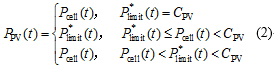 1)將ΔP(t)作為限功率算法的輸入?yún)?shù);然后,該算法再根據(jù)電網(wǎng)規(guī)定的光伏并網(wǎng)功率允許波動(dòng)值Pglimit和儲(chǔ)能PCS的最大輸出功率PES,max對(duì)光伏PCS的MPPT工作點(diǎn)作出調(diào)整,得到光伏MPPT的功率上限參考值P* limit (取值為0.1CPV~CPV,CPV為光伏的裝機(jī)容量/kWp)。Pcell為光伏電池當(dāng)前最大可輸出功率,為了滿足平抑功率波動(dòng)的需要,光伏PCS的輸出功率PPV滿足如下:
