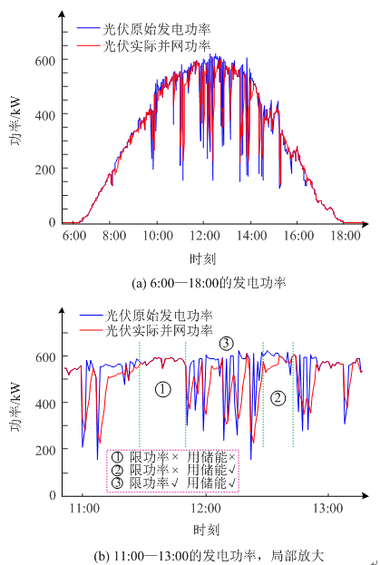 系統(tǒng)控制響應(yīng)速度分析:EMS從數(shù)據(jù)采集(≤200 ms),到控制指令計(jì)算(≤500 ms),再到控制指令下發(fā)(≤50 ms),這個(gè)過程大約耗時(shí)1 s。然后,儲(chǔ)能PCS能夠根據(jù)指令立即調(diào)整充放電功率,認(rèn)為其響應(yīng)時(shí)間≤1 s;同時(shí),光伏PCS調(diào)整MPPT工作點(diǎn),文獻(xiàn)[16]通過實(shí)驗(yàn)對(duì)光伏MPPT算法追蹤最大功率點(diǎn)的耗時(shí)進(jìn)行了測(cè)算,實(shí)驗(yàn)數(shù)據(jù)表明追蹤耗時(shí)的平均值為0.44 s。綜上,本文策略執(zhí)行一次的總響應(yīng)延時(shí)約為2 s,遠(yuǎn)小于1 min的采樣間隔,上述控制策略能夠良好地追蹤光伏的功率波動(dòng)。