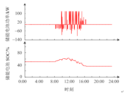 儲(chǔ)能電池的充放電功率曲線和對(duì)應(yīng)的SOC變化曲線如圖8所示。從仿真結(jié)果可以看出,本文所提策略能夠控制儲(chǔ)能電池工作在“淺充淺放”狀態(tài)下,儲(chǔ)能電池的SOC在50%附近波動(dòng)。其次,儲(chǔ)能PCS的充放電功率始終在[-120, 120]kW的安全約束范圍內(nèi),證明了本文所提的儲(chǔ)能控制策略的正確性。