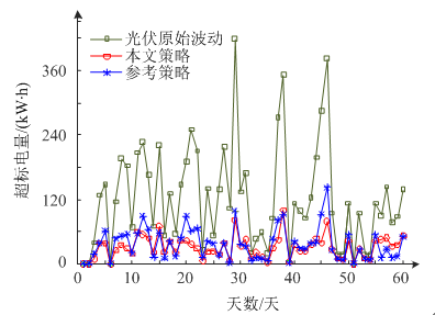計(jì)算得出光伏原始功率超標(biāo)電量、經(jīng)本文策略以及經(jīng)參考策略平抑后的超標(biāo)電量的平均值分別為:123.27 kW?h/天、31.67 kW?h/天、37.39 kW?h/天。從超標(biāo)電量的均值來看,本文所提策略和參考策略都能有效地平抑光伏功率波動(dòng),但本文策略超標(biāo)電量的平均值更小,平抑效果更好。
