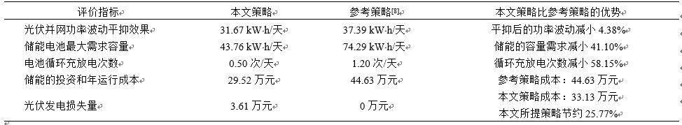 本文所提策略雖能降低儲(chǔ)能的投資和運(yùn)行成本,但光伏的限功率控制會(huì)導(dǎo)致光伏發(fā)電量損失。為了評(píng)估所提策略的經(jīng)濟(jì)性,本文和常規(guī)利用儲(chǔ)能平抑光伏功率波動(dòng)的策略[8]進(jìn)行了對(duì)比。從該光伏電站全年的運(yùn)行數(shù)據(jù)中選取了60個(gè)典型日(每月5天)的功率曲線作為仿真樣本,然后以5個(gè)方面的評(píng)價(jià)指標(biāo)對(duì)策略的執(zhí)行效果進(jìn)行對(duì)比分析。