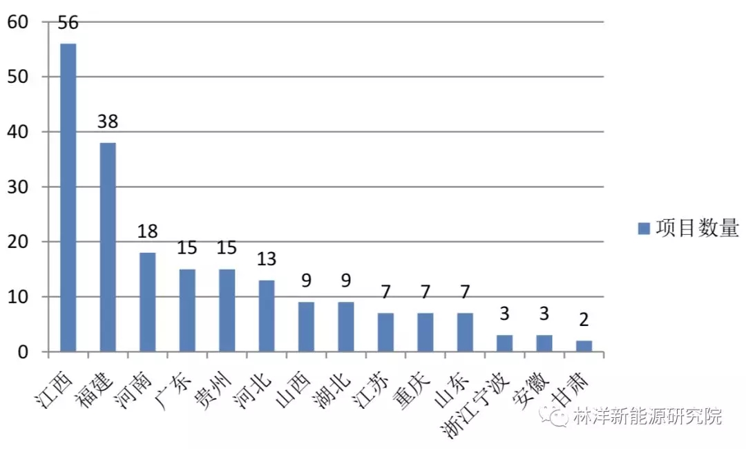 在項(xiàng)目數(shù)量上,江西和福建項(xiàng)目最多,分別為56個和38個項(xiàng)目。安徽和甘肅最少分別只有3個和2個。