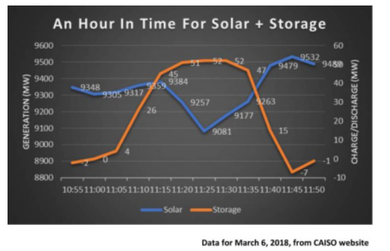 從這個圖表可以清楚看到,這個電池儲能系統(tǒng)正在用平滑可變可再生能源產(chǎn)出的短期波動,在這種情況下是太陽能發(fā)電系統(tǒng)正在運(yùn)行,太陽能光伏發(fā)電量約為9,300兆瓦。然后,隨著太陽能運(yùn)行略微下降,工作人員接入電池,并在接下來的20分鐘內(nèi)將電源注入電網(wǎng)。一旦太陽能發(fā)電系統(tǒng)產(chǎn)生的電力再次增加,運(yùn)營商就重新使用電池的輸出電力。
