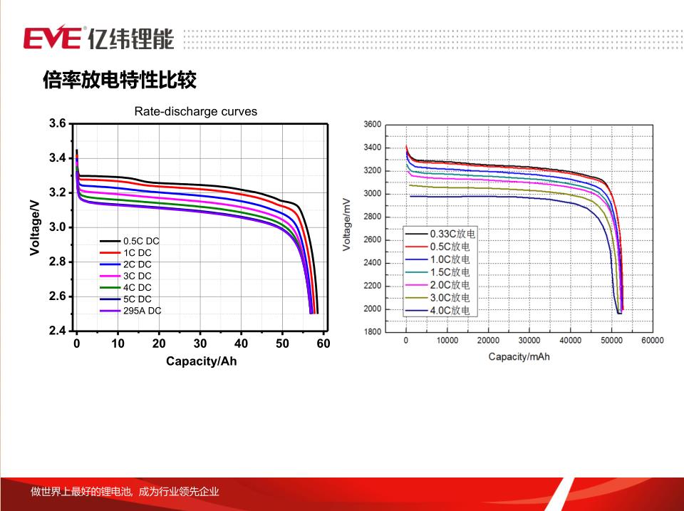 這幾條曲線大概是5.5c的功率情況,它的一致性趨勢(shì)還是比較趨同的。我們看一下對(duì)比。左邊的這條曲線是高倍率電芯,右邊曲線是普通的磷酸鐵鋰常用的電芯。我們細(xì)看一下這個(gè)曲線,以2C放電,2C現(xiàn)在基本在調(diào)峰調(diào)頻里大部分的配比都是2:1,調(diào)頻的指令時(shí)間段是相關(guān)的。2C本身的曲線,這邊是高倍率放電特性來(lái)講,藍(lán)色的曲線在整個(gè)放電的過(guò)程中,有很大一段電壓平臺(tái)仍然是在3.2V以上;一個(gè)常規(guī)電芯常規(guī)放電初期就已經(jīng)跌落到了2.3V以下,實(shí)際上它的倍率是不夠的。再看一下,到3C的時(shí)候,這條線已經(jīng)跌落到了3.1V以下,而且線本身的斜率是更加平緩的;這邊從高倍率的電芯來(lái)看,下降的趨勢(shì)雖然區(qū)間小,但是它的斜率相對(duì)來(lái)說(shuō)還是比較大的。我們跟BMS的廠家去交流,還在溝通過(guò)程中,如果采用倍率性不高的電芯,與BMS管理的時(shí)候,電壓波動(dòng)的平臺(tái)太窄,所以對(duì)于BMS在管理控制中難度是增加的。反過(guò)來(lái)講,現(xiàn)在BMS的成本要降本,這是一個(gè)矛盾。所以,如果說(shuō)本身從電芯的角度來(lái)講,把高倍率提升之后,對(duì)于BMS設(shè)計(jì)上來(lái)講是可以做簡(jiǎn)化的。與此同時(shí),電芯的改進(jìn)不僅僅是電芯本身的高倍率性提升了,作為整個(gè)儲(chǔ)能系統(tǒng)三大部件最核心的一塊,它的性能提升是可以支撐我相關(guān)部件降本的進(jìn)一步的實(shí)現(xiàn)。