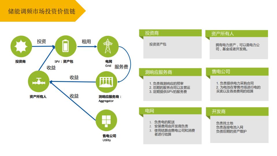 儲能在英國項目上投資的價值鏈跟大家也分享一下,因為目前山西的幾個調(diào)頻電廠,就是由火電廠和電網(wǎng)公司直接交易,在這個環(huán)節(jié)上偏單薄一點(diǎn)。我們在英國有兩個角色非常關(guān)鍵。資產(chǎn)所有人就是我們的電站,電站直接跟電網(wǎng)公司交易,這是不被允許的。交易的時候是需要有兩個資質(zhì)的,拿不到這個資質(zhì)是沒有資格跟電網(wǎng)公司交易的。為什么這么設(shè)置?英國本身算是一個固網(wǎng)的電網(wǎng),因為它是一個島嶼,就設(shè)置了資產(chǎn)包的角色。另外還有一個關(guān)鍵的角色售電公司,咱們中國的售電已經(jīng)也有兩年的發(fā)展了,發(fā)展得也很迅速。儲能和售電怎么結(jié)合來參與電網(wǎng)的服務(wù)?在英國也是這樣去操作的。
